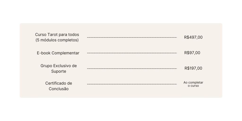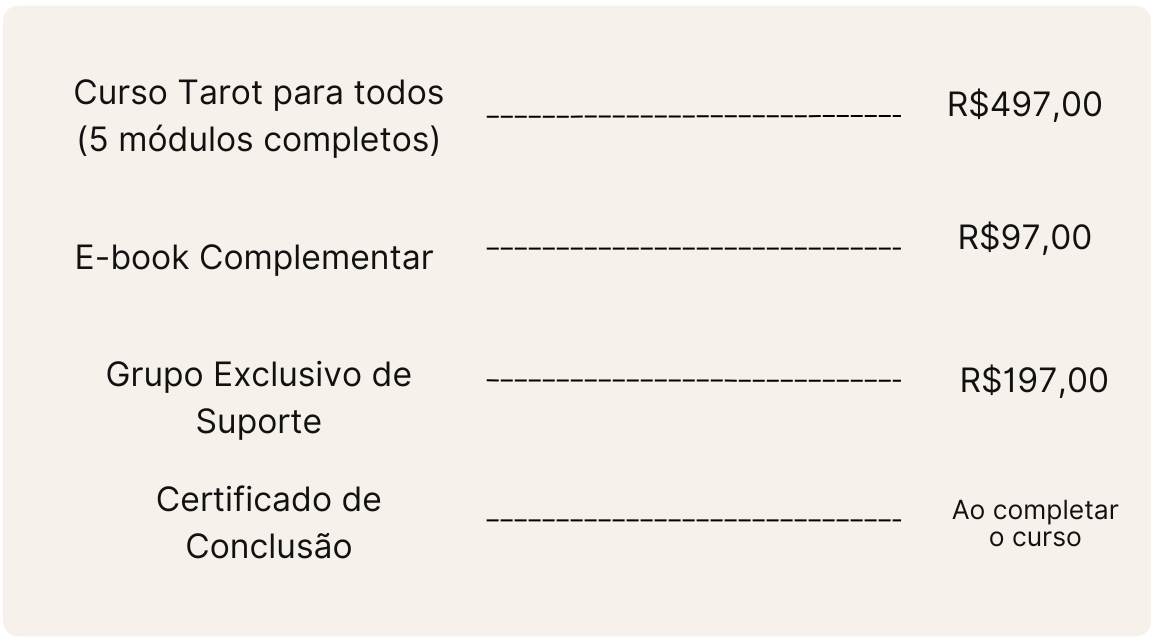 Clique no botão abaixo para garantir o seu acesso ao Curso Tarot para Todos e receber todos os bônus incríveis que preparei para você. Lembre-se, a sua jornada no Tarot começa agora!